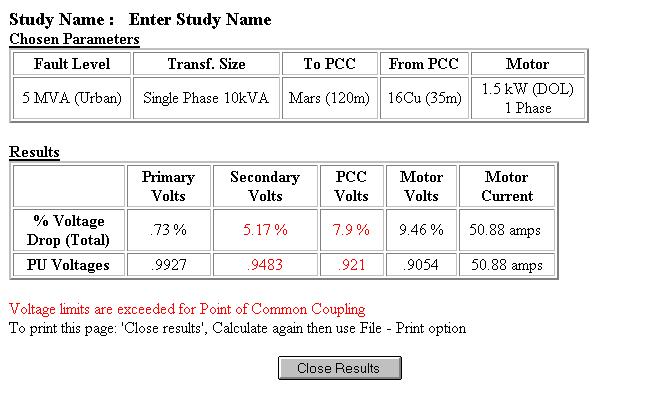 In this example the maximum voltage dip has been exceeded at both the point of common coupling and the LV terminals of the transformer. Even if the customer had a dedicated line from the transformer the dip would exceed voltage limits for any other customers connected to the transformer. If the transformer was dedicated for the sole use of the customer this solution would be acceptable, If the transformer was uprated to single phase 25kVA, the voltage dip at the point of common coupling would still exceed 5% (5.54%). The transformer volts would be OK (2.75%) to supply other customers from the LV terminals.